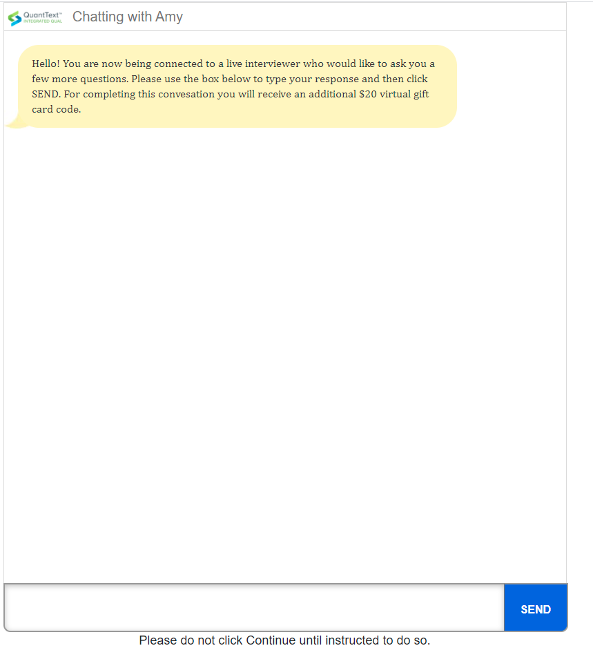 - At the point in the survey that the one-on-one chat should take place, the data collection software tool should provide a blank page with a "NEXT" or "CONTINUE" button at the bottom of the screen.